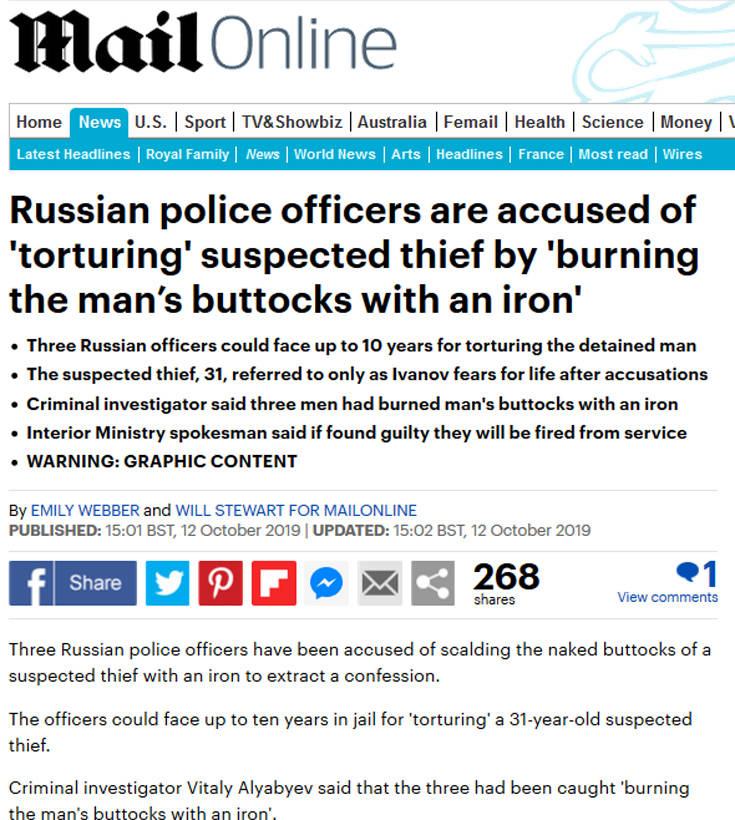 Στο δικαστήριο οδηγήθηκαν τρεις Ρώσοι αστυνομικοί μετά από καταγγελία 31χρονου υπόπτου για ληστεία ότι τον βασάνισαν με σίδερο για να αποσπάσουν την ομολογία του και στη συνέχεια «έκαψαν τα οπίσθια του χρησιμοποιώντας ένα σίδερο».