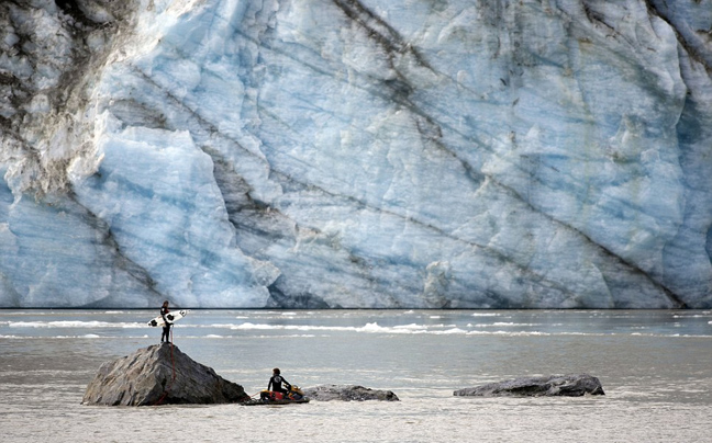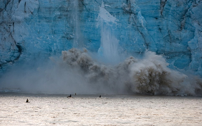 Οι McNamara και Mamala, ο ένας με σανίδα του σερφ και ο άλλος με τζετ σκι τα έπαιξαν όλα για όλα κάτω από τον παγετώνα Child στην Αλάσκα καταφέρνοντας να μείνουν πάνω στο κύμα την ώρα που η κατάρρευση δονεί τη θάλασσα και το βουητό είναι εκκωφαντικό.