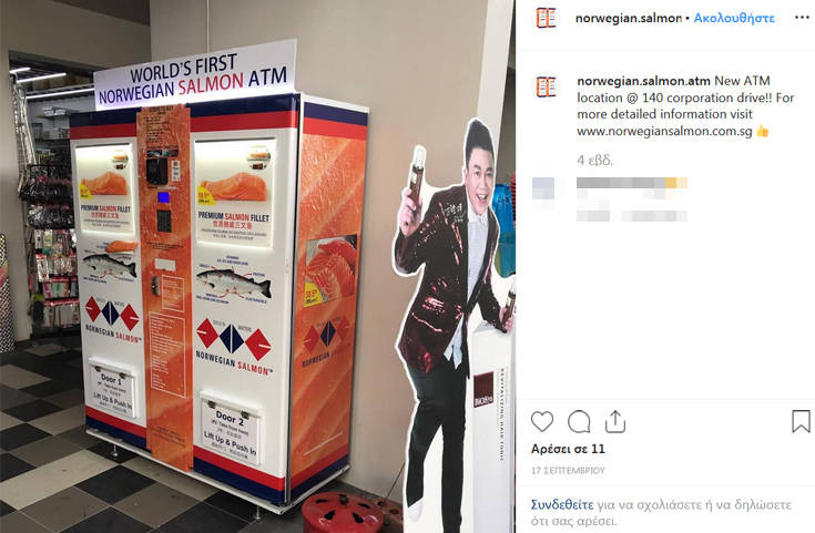 Στη Σιγκαπούρη ο σολομός που βγάζουν τα ΑΤΜ είναι η νέα μόδα που ξεκίνησε τον περασμένο Ιανουάριο στο mall Wisteria και έκτοτε τα αυτόματα μηχανήματα φύτρωσαν σε διάφορα σημεία της νησιωτικής χώρα.
