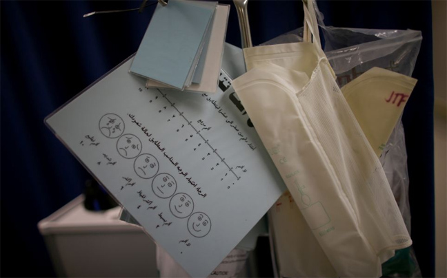 Οι περισσότεροι κρατούμενοι μεταφέρονται σε ειδικούς «θαλάμους σίτισης» αλλά κάποιοι «τρέφονται» στο νοσοκομείο της βάσης, από όπου τραβήχτηκαν και αυτές οι φωτογραφίες. Τους ζητείται δε να δείξουν σε ένα σχεδιάγραμμα με έξι πρόσωπα το βαθμό του πόνου που νιώθουν.