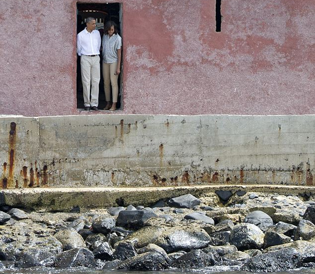 Η οικογένεια Ομπάμα περιηγήθηκε στο μουσείο στο Σπίτι των Σκλάβων, όπου οι σκλάβοι συγκεντρώνονταν πριν περάσουν από την «πόρτα χωρίς επιστροφή» κι από εκεί μέσα στα πλοία με προορισμό τη Βόρεια Αμερική.