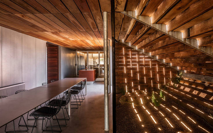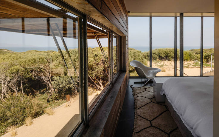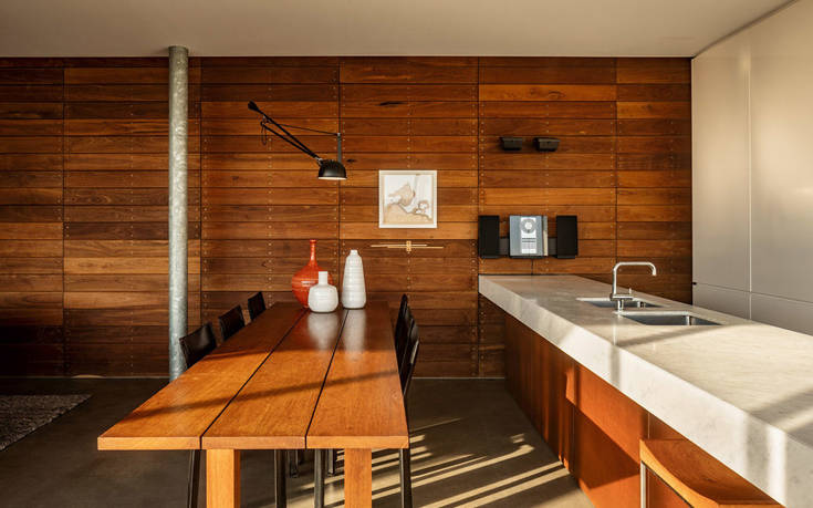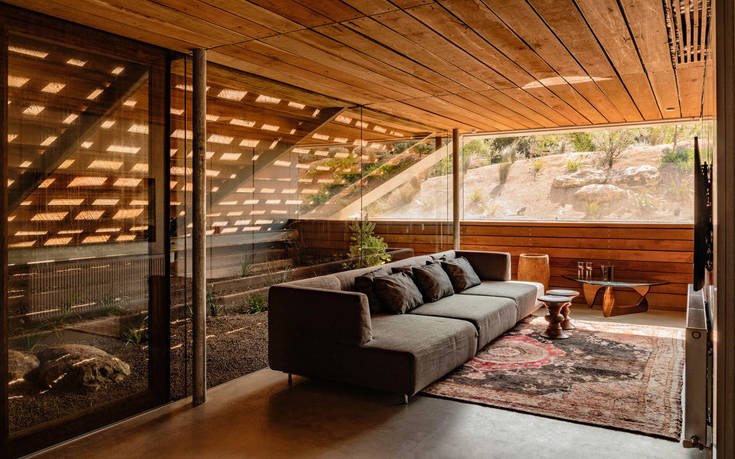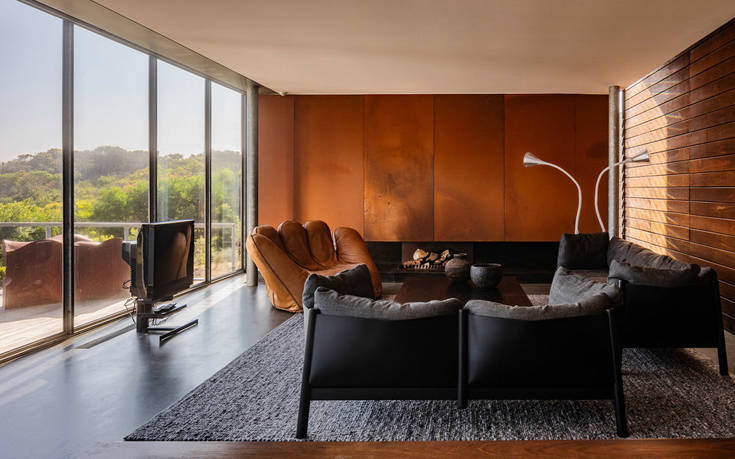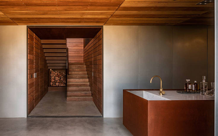 Η ίδια αισθητική επικρατεί και στο εσωτερικό, με τα σκουριασμένα μέταλλα και τα παστέλ χρώματα να δένουν υπέροχα με τη μοντέρνα επίπλωση και τις τζαμαρίες από το πάτωμα ως το ταβάνι.