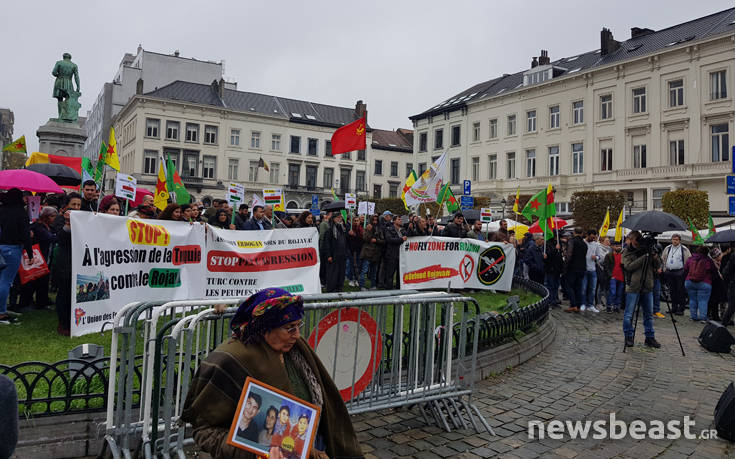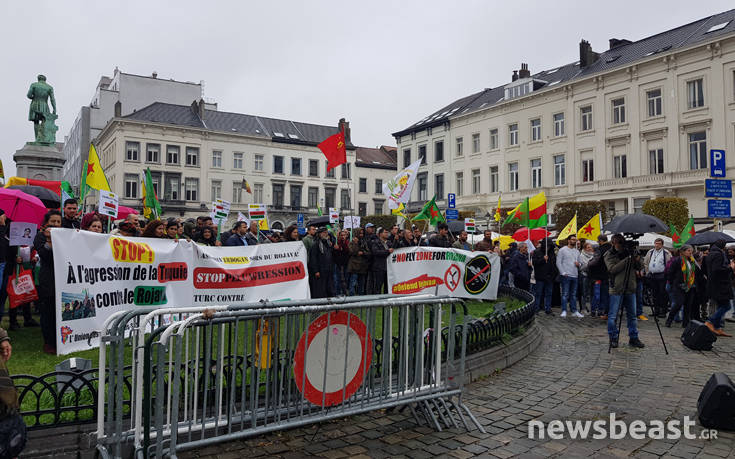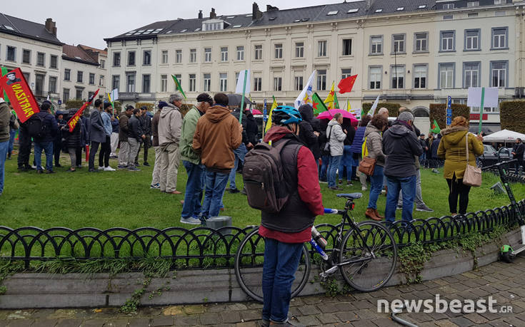 Με σημαίες, συνθήματα και κόρνες μερικές δεκάδες Κούρδων συγκεντρώθηκαν πριν από λίγη ώρα υπό βροχή έξω από το Ευρωκοινοβούλιο, διαμαρτυρόμενοι για την επίθεση του τουρκικού στρατού στη Συρία, όπως φαίνεται και στις αποκλειστικές πληροφορίες που εξασφάλισε το newsbeast.gr.