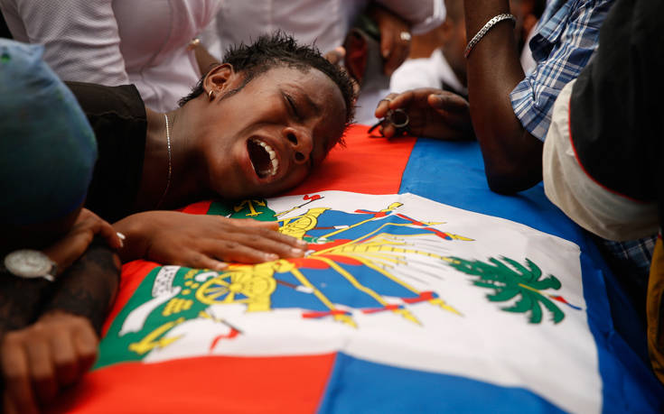 Μια γυναίκα θρηνεί πάνω από το φέρετρο ενός παιδιού που άφησε την τελευταία του πνοή σε ηλικία 16 ετών, με τον πόνο να είναι ζωγραφισμένος στο πρόσωπό της. Κάποιοι φοιτητές της Εθνικής Σχολής Καλών Τεχνών ζωγράφισαν έναν τοίχο στο Πορτ-ο-Πρινς, για να συμπαρασταθούν σε όσους σκοτώθηκαν στην προσπάθεια να ανατραπεί ο πρόεδρος Μόιζε.