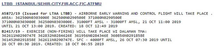 Την Παρασκευή (19/10) η Τουρκία με ΝΟΤΑΜ μετακίνησε πιο νότια την περιοχή που δεσμεύει συνήθως για τις πτήσεις των εναέριων ραντάρ της, προκειμένου να προσπαθήσει να αποκτήσει σήμερα καλύτερη εικόνα της Ανατολικής Μεσογείου.