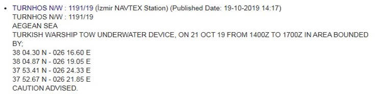Στο Αιγαίο, το Τουρκικό Πολεμικό Ναυτικό, σύμφωνα με την εξαγγελία του σταθμού της Σμύρνης και όπως μεταφέρει το news.gr, που σημειωτέον δεν έχει καμιά δικαιοδοσία εντός FIR Αθηνών, θα στείλει σήμερα πολεμικό της πλοίο να ρυμουλκήσει υποβρύχια συσκευή μεταξύ Χίου, Σάμου και Ικαρίας.