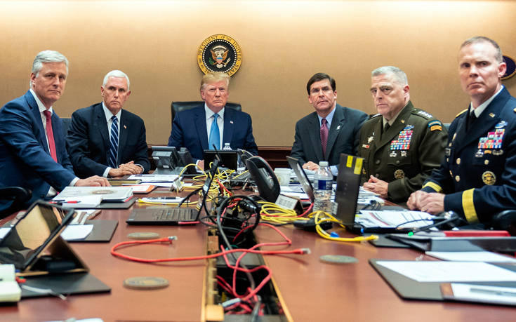 -Το Σάββατο, ο Ντόναλντ Τραμπ επέστρεψε στον Λευκό Οίκο γύρω στις 04.30 το απόγευμα τοπική ώρα έπειτα από ένα παιχνίδι γκολφ στη Βιρτζίνια, βάσει του επίσημου προγράμματός του. Γύρω στις 5 το απόγευμα, συναντήθηκε στην ειδικά διαμορφωμένη αίθουσα συνεδριάσεων του Λευκού Οίκου Situation Room με τον αντιπρόεδρο της χώρα Μάικ Πενς, τον υπουργό Άμυνας Μαρκ Έσπερ, τον σύμβολο εθνικής ασφαλείας Ρόμπερτ Ο Μπράιαν και άλλους αξιωματούχους των υπηρεσιών πληροφοριών. Παρακολούθησαν ζωντανά την επιχείρηση «σαν να βλέπεις ταινία», περιέγραψε ο πρόεδρος των ΗΠΑ.