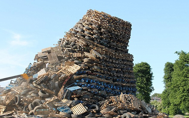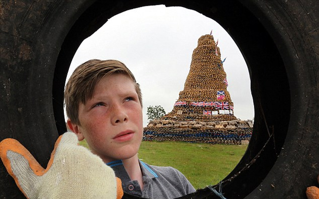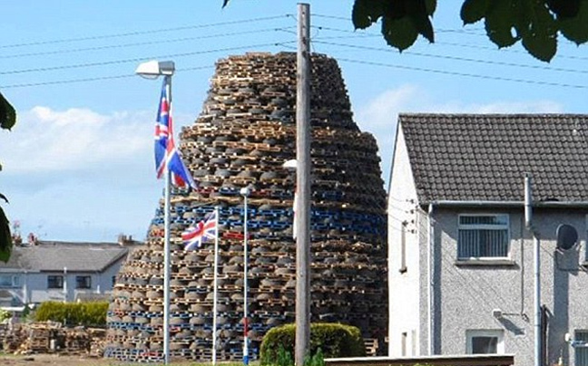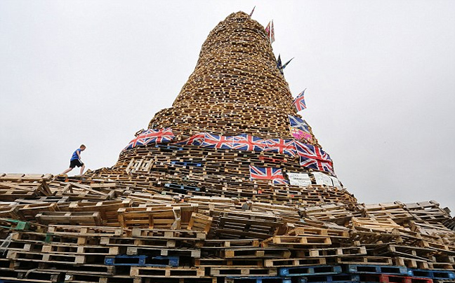 Πολύ διαφορετική είναι αυτές τις ημέρες η εικόνα του Μπέλφαστ. «Πύργοι» από λάστιχα και παλέτες έχουν στηθεί σε πολλά σημεία της πόλης καθώς η Βόρεια Ιρλανδία προετοιμάζεται για τους εορτασμούς για τη Μάχη του Boyne.