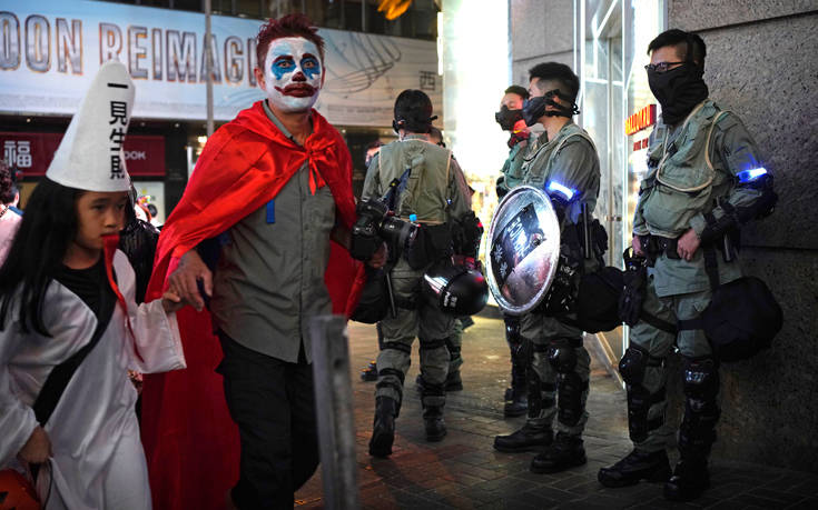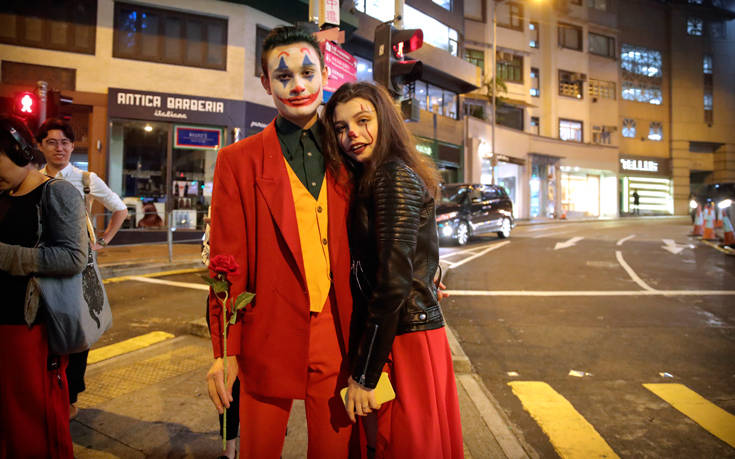 Κάποιοι φορούσαν μάσκες Γκάι Φωκς και άλλοι ήταν ντυμένοι κλόουν. Κάποιος άλλος ήταν ντυμένος στα κόκκινα, σε μια προφανή αναφορά στον πρωταγωνιστικό χαρακτήρα της ταινίας Joker. «Σταματήστε να μπλοκάρετε τον δρόμο. Άντε γ…τε», φώναζαν στους αστυνομικούς. «Θέλουμε να πιούμε. Δεν μπορείτε να αφήσετε τον κόσμο μια φορά να διασκεδάσει;». Ένας 43χρονος, ονόματι Γκόρντον, που πήγε στην περιοχή για να διασκεδάσει, δήλωσε: «Ελπίζω σήμερα να μην υπάρξει αστυνομία, να μην γίνουν συγκρούσεις. Όλοι είναι χαρούμενοι» και ενώ απομακρυνόταν φώναζε: «Ελευθερώστε το Χονγκ Κονγκ».