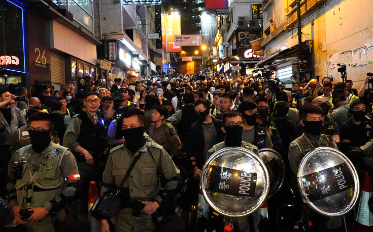Εκατοντάδες διαδηλωτές, πολλοί ντυμένοι από πάνω ως κάτω στα μαύρα και φορώντας μάσκες προσώπου –η χρήση των οποίων έχει τώρα απαγορευθεί– γονάτισαν στο οδόστρωμα βασικής οδικής αρτηρίας και προσπάθησαν να προφυλαχθούν πίσω από ομπρέλες, εξοργισμένοι με τη βίαιη καταστολή από τις αστυνομικές αρχές των διαδηλώσεων στο σημείο εκείνο πριν από δύο μήνες. Πολλοί εξ αυτών στοχοθέτησαν τους αστυνομικούς με ακτίνες λέιζερ ενώ άλλοι έφτιαξαν εμπόδια στους δρόμους με κάδους απορριμμάτων και μπάζα, μια προσφιλή τους τακτική τους τελευταίους μήνες. Οι διαδηλωτές απέκλεισαν διασταυρώσεις στη λεωφόρο Νάθαν, που αποτέλεσε τον στόχο των ακτιβιστών το περασμένο σαββατοκύριακο, έσπασαν φανοστάτες και πήραν πλάκες και άλλα υλικά από τα πεζοδρόμια και τις βιτρίνες των καταστημάτων, κρυμμένοι πίσω από τις ομπρέλες που κρατούσαν οι υπόλοιποι συγκεντρωμένοι.