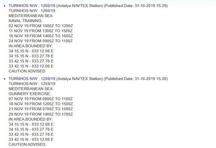 Η Τουρκία, ωστόσο, με δύο παράνομες NAVTEX δέσμευσε για σχεδόν όλο τον Νοέμβριο μια μεγάλη περιοχή νότια της Κύπρου και δυτικά του σημείου που κινείται το ερευνητικό «Μπαρμπαρός» για ασκήσεις του Πολεμικού Ναυτικού της.