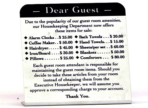 Η εν λόγω πινακίδα δεν θα είχε καμιά σημασία και αξία, αν δεν ήταν ο έξυπνος τρόπος που σκέφτηκαν οι ιδιοκτήτες του μοτέλ για να αποτρέψουν την αρπαγή διάφορων πραγμάτων από τα δωμάτια. Με άλλα λόγια, οι άνθρωποι στο μοτέλ ανακάλυπταν συχνά πυκνά ότι έλειπαν διάφορα αντικείμενα από τα δωμάτια κατά την αποχώρηση ορισμένων πελατών τους. Αντί, λοιπόν, να βάλουν κάμερες ασφαλείας ή να έχουν όλα τα αντικείμενα κλειδωμένα σε ένα κουτί, αποφάσισαν να βάλουν μια τέτοια πινακίδα που ονοματίζει τα αντικείμενα του δωματίου (σεντόνια, πετσέτες, μαξιλάρια, ρολόγια, κουβέρτες), τιμολογώντας τα όμως πολύ ακριβά.