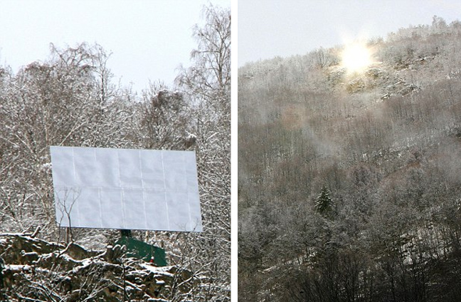 Ωστόσο αυτό θα αλλάξει καθώς εδώ και λίγες εβδομάδες, με τη βοήθεια ελικοπτέρων, τοποθετήθηκαν στη βουνοπλαγιά τρεις τεράστιοι καθρέφτες, περίπου 450 μέτρα πάνω από την πόλη.