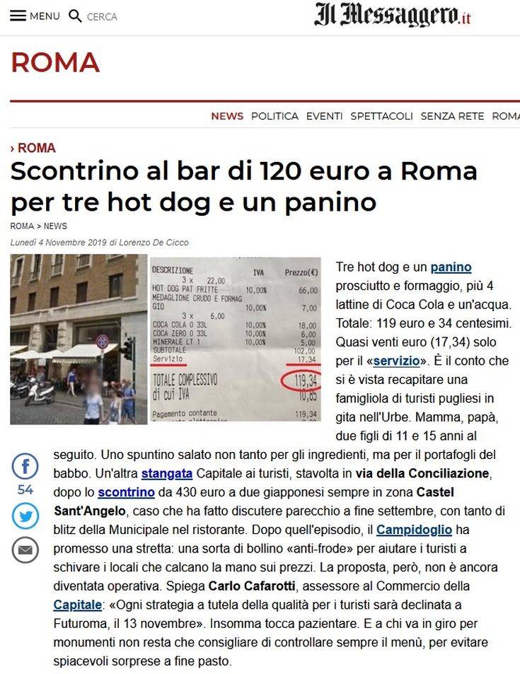 «Ακόμη ένα “δάγκωμα” σε τουρίστες στην πρωτεύουσα οικογένεια με τους δύο γονείς και τα παιδιά 11 και 15 ετών, που θέλησαν να καθίσουν στο μπαρ τη φορά αυτή στη Βία ντελα Κοντσιλιατσιόνε. Μετά τον λογαριασμό των 430 ευρώ στην ίδια ζώνη του Καστελ Σαντ’ Άντζελο σε ζευγάρι Γιαπωνέζων, ένα συμβάν που συζητήθηκε ιδιαίτερα τον περασμένο Σεπτέμβριο και οδήγησε σε έρευνα των δημοτικών αρχών στο εστιατόριο αυτό», υπενθυμίζει η Messaggero.