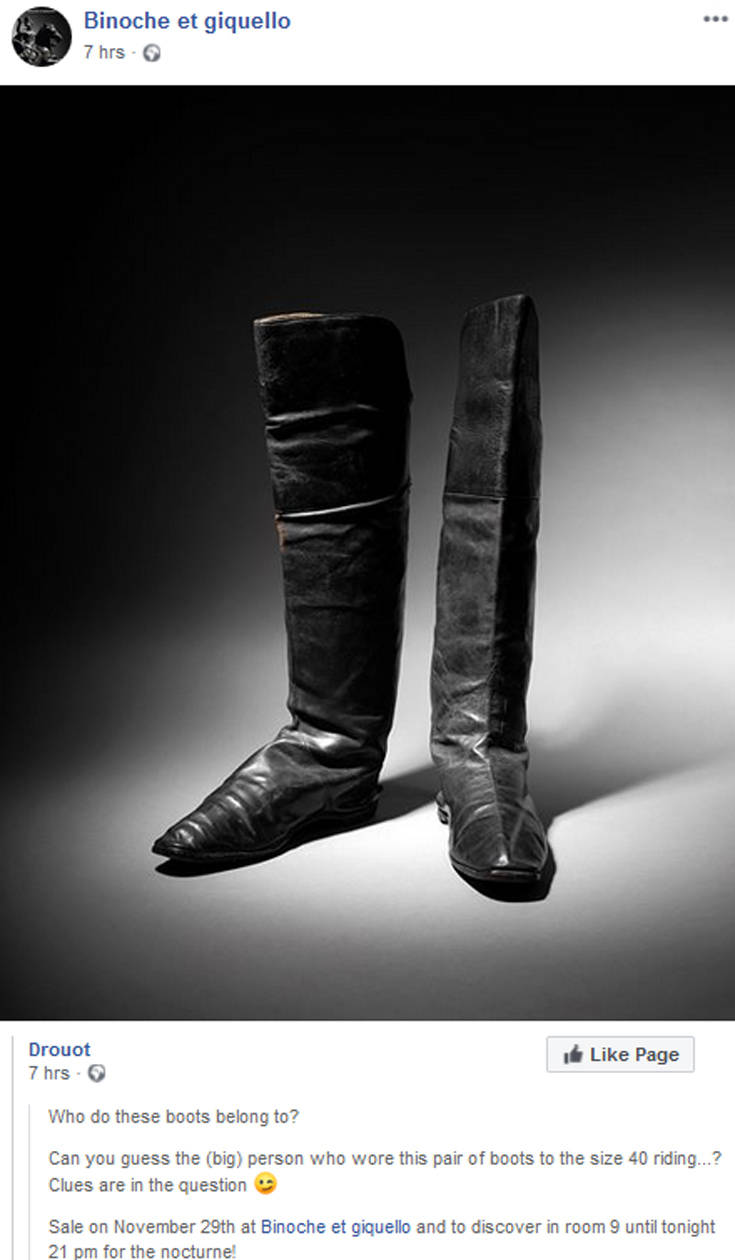 Ένα ζευγάρι μπότες, νούμερο 40, τις οποίες φορούσε ο Ναπολέων Α΄ στην εξορία του στην Αγία Ελένη θα βγουν στο «σφυρί» στις 29 Νοεμβρίου από τον οίκο Binoche et Giquello στο Παρίσι, ανακοινώθηκε την Πέμπτη.