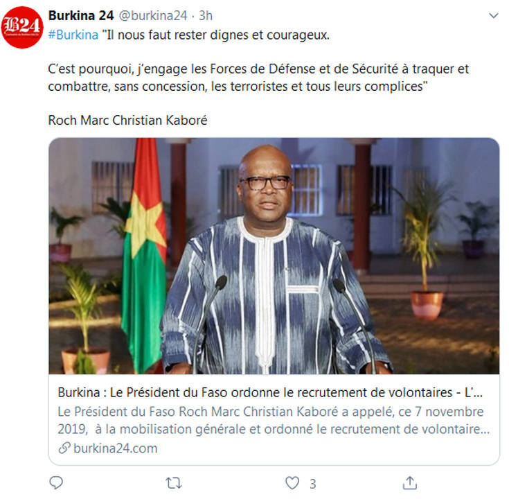 Τριήμερο εθνικό πένθος κηρύχτηκε την Πέμπτη στη Μπουρκίνα Φάσο μετά την ενέδρα χθες εναντίον αυτοκινητοπομπής καναδικής μεταλλευτικής εταιρίας, στην οποία 38 άνθρωποι έχασαν τη ζωή τους, σύμφωνα με έναν τελευταίο απολογισμό. Η επίθεση που αποδίδεται στους τζιχαντιστές είναι η πιο αιματηρή που έχει γνωρίσει η χώρα.