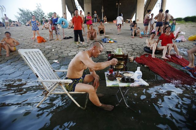 Αναζητώντας λίγη δροσιά, πολλοί κάτοικοι της επαρχίας Hubei έσπευσαν στον ποταμό Hanjiang για μπάνιο και παιχνίδια στο νερό. Κάποιοι δεν έχασαν την ευκαιρία να απολαύσουν το γεύμα τους μέσα στο νερό.