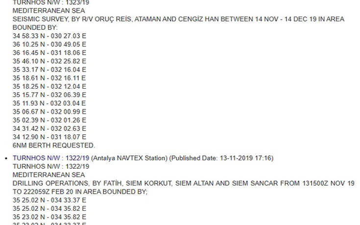 Όπως αναφέρει το news.gr, σύμφωνα με αυτές το πλωτό γεωτρύπανο Πορθητής ξαναβγαίνει στη θάλασσα και θα μεταβεί νότια του Ριζοκάρπασου όπου σύμφωνα με την τουρκική εξαγγελία θα πραγματοποιήσει γεωτρήσεις από σήμερα μέχρι και τις 22 Φεβρουαρίου 2020. Η δεύτερη NAVTEX αφορά το σεισμογραφικό Ορούτς Ρέις και δεσμεύει σχεδόν όλη την δυτική κυπριακή ΑΟΖ από αύριο μέχρι και τις 14 Δεκεμβρίου.
