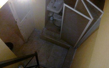 Στο «ευρύχωρο» εσωτερικό του το διαμέρισμα χωράει μετά βίας ένα υπερυψωμένο κρεβάτι ενώ στο μπάνιο έχει τα απολύτως απαραίτητα… μια λεκάνη, ένα νεροχύτη και μια ντουζιέρα!