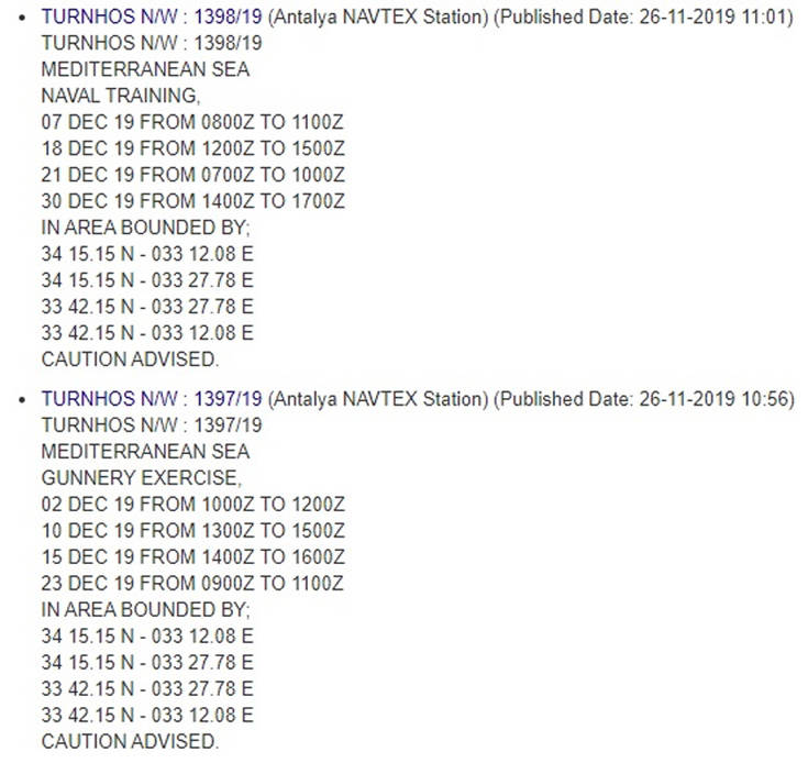 Την ίδια στιγμή, η Άγκυρα εξέδωσε δύο παράτυπες NAVTEX, με τις οποίες δεσμεύει για πολλές μέρες μέσα στον Δεκέμβριο, περιοχή νότια της Κύπρου, κοντά στο σημείο που πλέει το ερευνητικό σκάφος της Barbaros. Η δέσμευση αφορά ναυτικές ασκήσεις με τη χρήση και πυρών, προφανώς σε μια προσπάθεια εκφοβισμού.