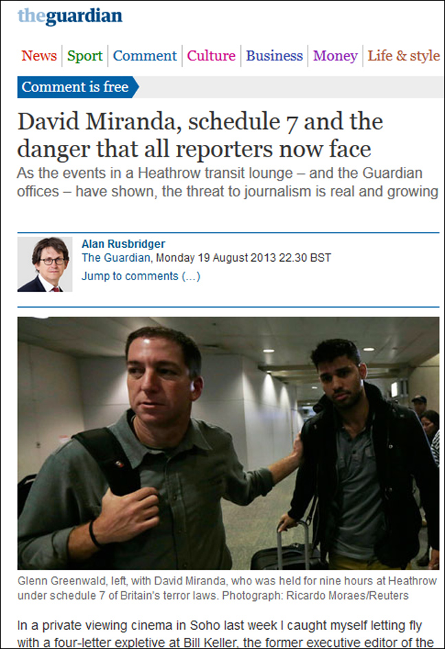 Την Κυριακή, οι βρετανικές αρχές κράτησαν και ανέκριναν επί εννέα ώρες στο αεροδρόμιο του Χίθροου τον Βραζιλιάνο Ντέιβιντ Μιράντα, σύντροφο του δημοσιογράφου του Guardian Γκλεν Γκρίνγουολντ, καθώς περνούσε τράνζιτ από το βρετανικό αεροδρόμιο στο ταξίδι του από το Βερολίνο προς το Ρίο ντε Τζανέιρο.
