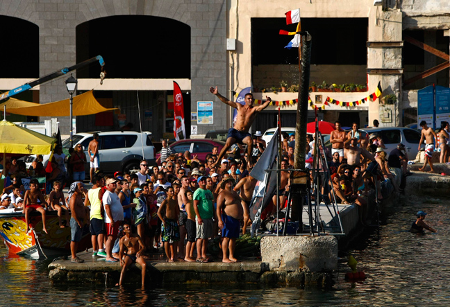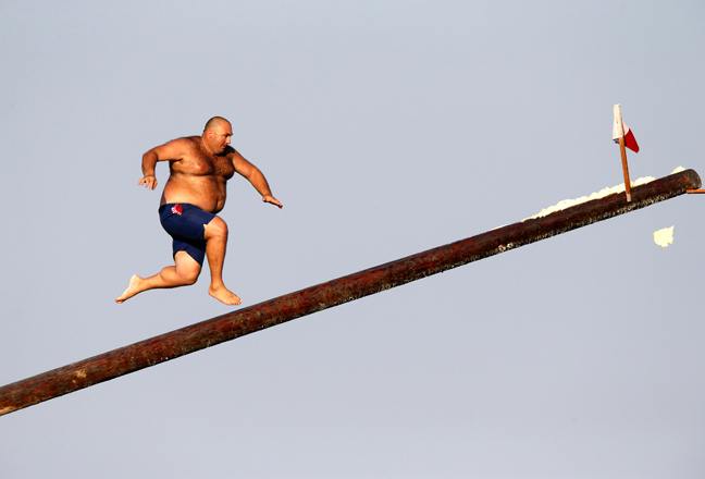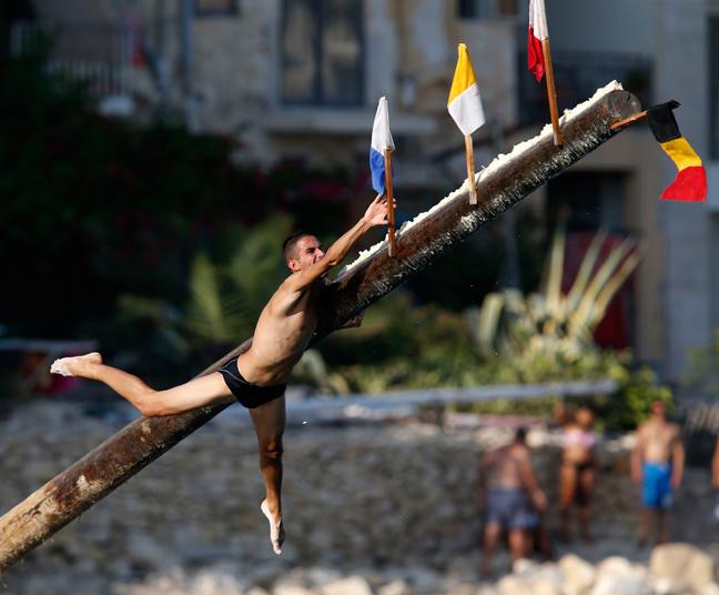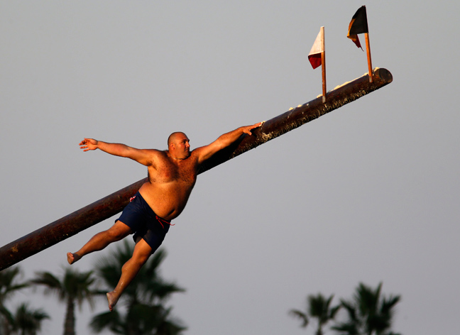 Η έξτρα δυσκολία της αναρρίχησης στο στύλο, με στόχο να πιάσουν μία από τις σημαίες στην άκρη του, είναι πως αυτός είναι καλυμμένος με… γράσο με αποτέλεσμα πολλές φορές το θέαμα να είναι ξεκαρδιστικό.