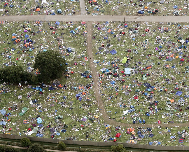 Το αποτέλεσμα είναι μία «θάλασσα» από κουτάκια μπύρας, αποτσίγαρα, μισοφαγωμένα φαγητά, περιτυλίγματα, ρούχα, sleeping bag, γαλότσες, εγκαταλειμμένες σκηνές και αντικείμενα που είτε ξεχάστηκαν είτε οι ιδιοκτήτες τους δεν τα ήθελαν πια.
