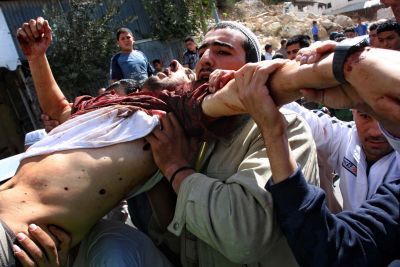 Παλαιστίνιοι κουβαλάνε το πτώμα του ανώτερου μαχητή της Χαμάς, Νασάντ αλ-Κάρμι