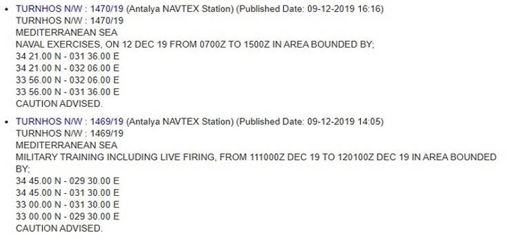 Τη Δευτέρα η Τουρκία προχώρησε σε παράτυπη δέσμευση δύο μεγάλων περιοχών μεταξύ Κύπρου και Κρήτη για ασκήσεις και με πραγματικά πυρά στις 11 και 12 Δεκεμβρίου.