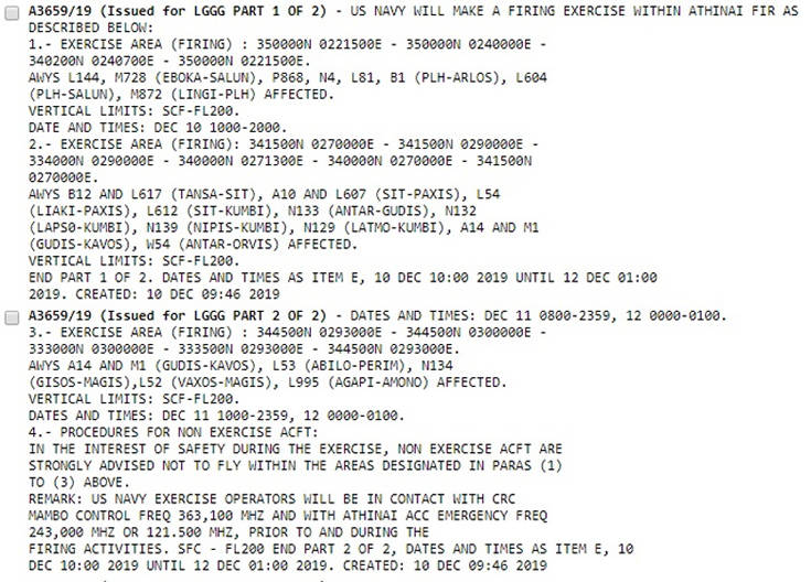 Σύμφωνα με ΝΟΤΑΜ που εξέδωσε χθες η Αθήνα και αποκαλύπτει το news.gr, στον ίδιο σχεδόν χώρο, δεσμεύτηκαν επίσης δύο περιοχές, που συμπίπτουν σε σημαντικό βαθμό με τις περιοχές που δέσμευσε παράτυπα η Τουρκία, για ασκήσεις με πραγματικά πυρά του αμερικανικού πολεμικού ναυτικού.