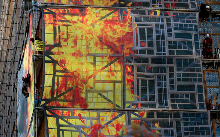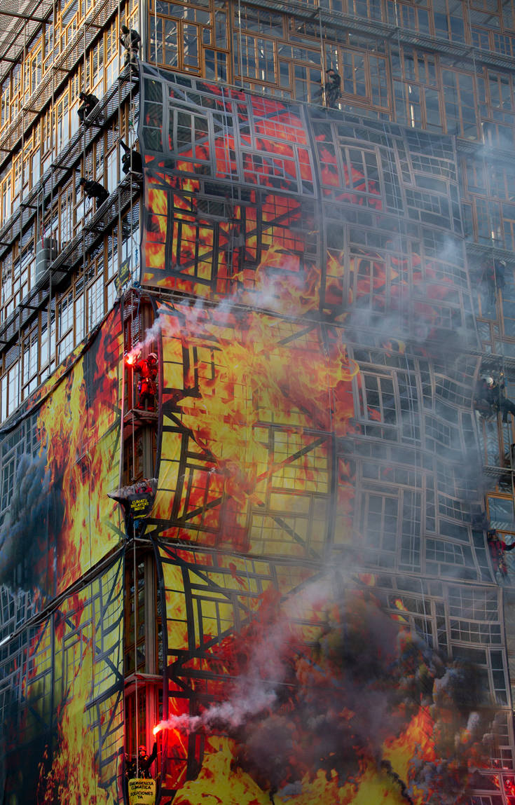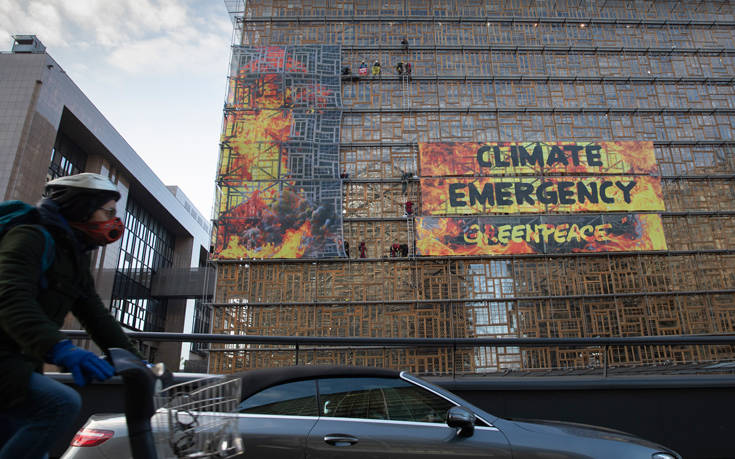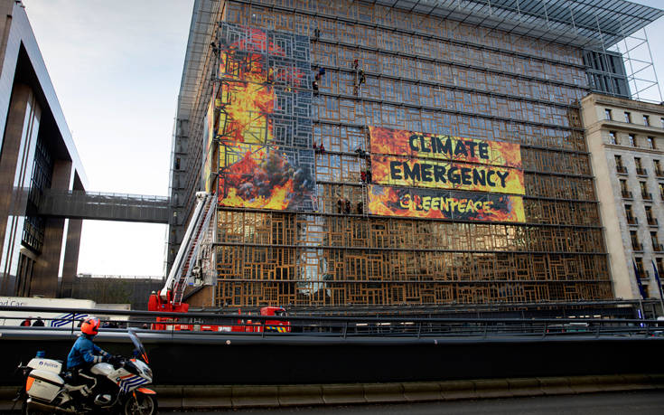 Οι ακτιβιστές σκαρφάλωσαν στην μεταλλική πρόσοψη του κτιρίου Europa, της νέας έδρας του Ευρωπαϊκού Συμβουλίου και άπλωσαν ένα μεγάλο πανό με το σύνθημα «Κλιματική Έκτακτη Ανάγκη». Χρησιμοποίησαν δε εφέ για να δώσουν την εντύπωση ότι το κτίριο φλέγεται.