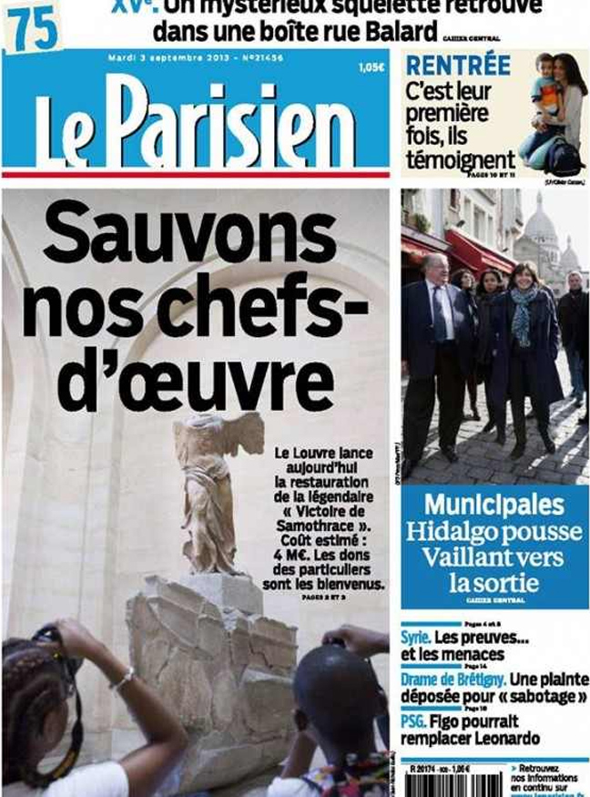 Με τον τίτλο «Να σώσουμε το αριστούργημά μας» και φωτογραφία της Νίκης της Σαμοθράκης που εκτίθεται στο Λούβρο κυκλοφορεί σήμερα η γαλλική εφημερίδα Le Parisien.