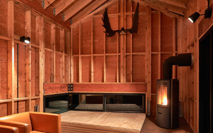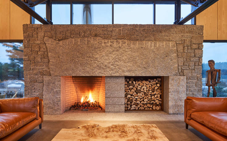 Χαλύβδινα δοκάρια, ταβάνια με επένδυση ξύλου, πέτρα και γρανίτης συμπληρώνουν τον εσωτερικό διάκοσμο.