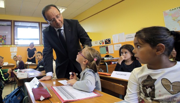 «Σήμερα αρχίζει η νέα σχολική χρονιά», «Σήμερα επιστρέφουμε…» γράφει ο πίνακας πίσω από τον Ολάντ, ενώ η γκριμάτσα που έχει πάρει ο Γάλλος Πρόεδρος είναι τουλάχιστον αστεία, με αποτέλεσμα πολλοί να τον παρομοιάσουν με τον «χαζό της τάξης».