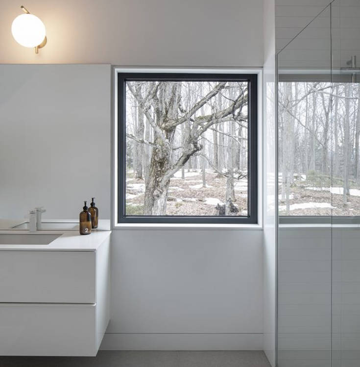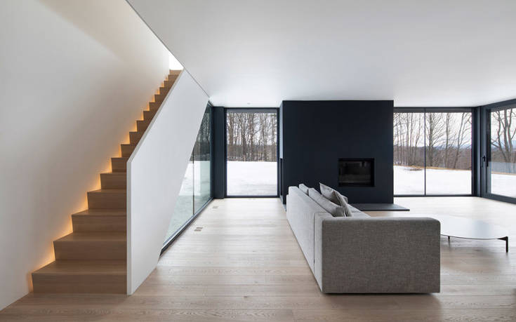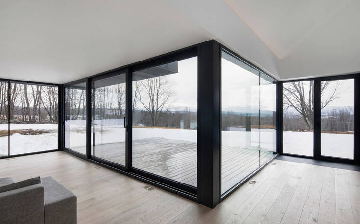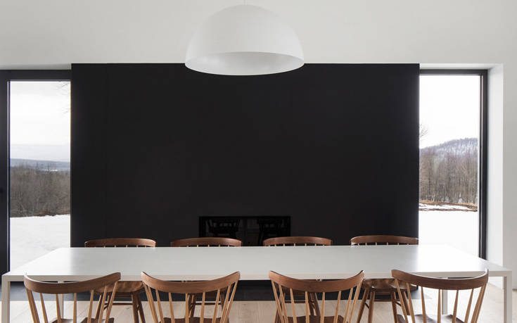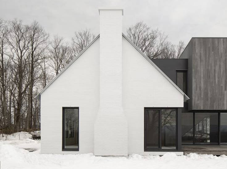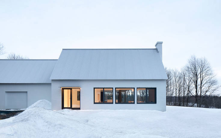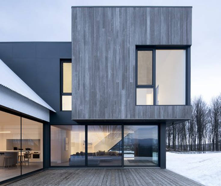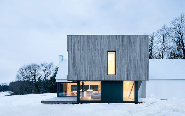 Οι πινελιές κέδρου στο εξωτερικό και τα σκούρα χρώματά τους κλείνουν το μάτι στο αγροτικό του τοπίου στις απομακρυσμένες επαρχίες του Κεμπέκ.