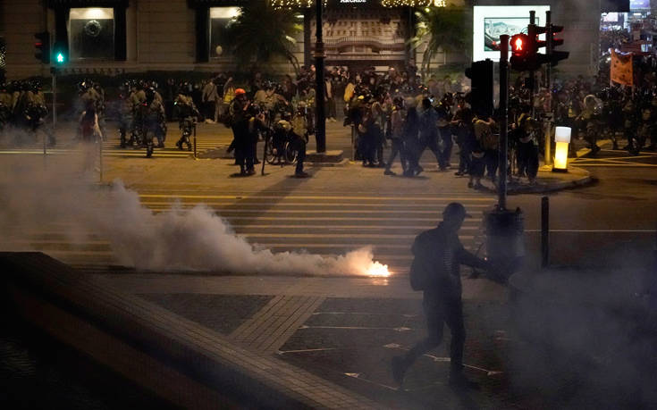 Η Αστυνομία έκανε χρήση δακρυγόνων, προκειμένου να διαλύσει τους διαδηλωτές που είχαν καταλάβει κύριους δρόμους έξω από εμπορικά κέντρα και κοντινά πολυτελή ξενοδοχεία, ανάμεσα στα οποία και το Peninsula, στην Τσιμ Σα Τσούι, στην τουριστική συνοικία Καουλούν.