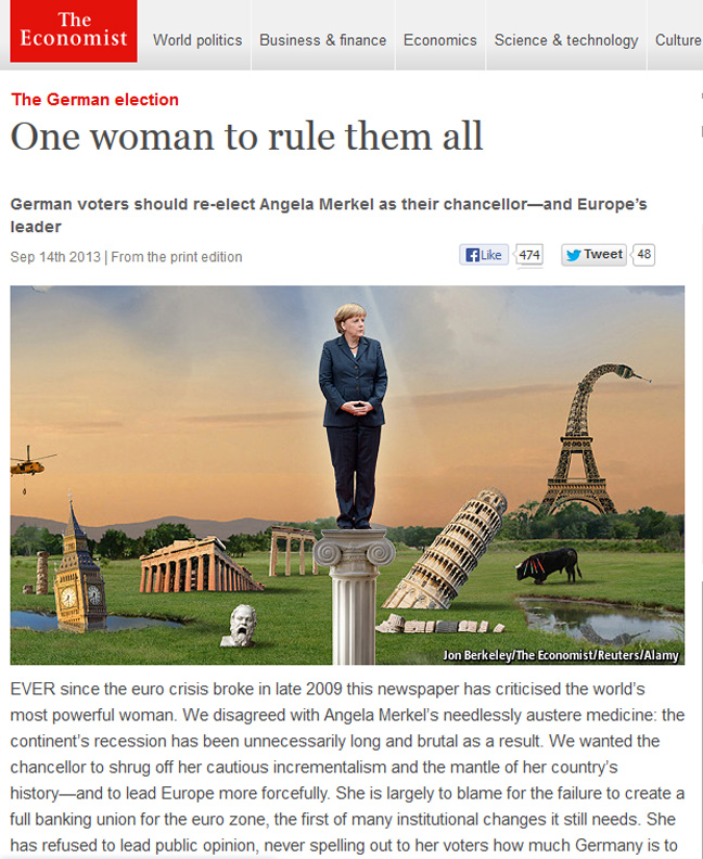 «Μία γυναίκα για να κυριαρχήσει σε όλους» γράφει το περιοδικό Economist σε πρωτοσέλιδο αφιέρωμά του με την Άνγκελα Μέρκελ να εικονίζεται πάνω σε έναν κίονα ιωνικού ρυθμού και γύρω της τα ευρωπαϊκά ερείπια. Ο Παρθενώνας, ο Πύργος της Πίζας και το Big Ben βουλιάζουν, ενώ ο Πύργος του Άιφελ λυγίζει.