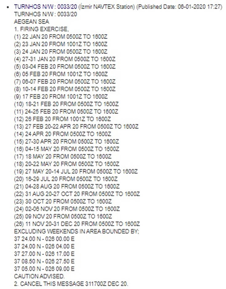 Συγκεκριμένα στην πρώτη περίπτωση δέσμευσε την περιοχή μεταξύ Θάσου, Σαμοθράκης και Λήμνου για πολλαπλά χρονικά διαστήματα μέσα στο 2020 και συγκεκριμένα μέχρι το τέλος του χρόνου, για ασκήσεις με πυρά.