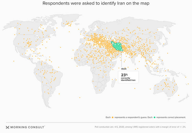 Σύμφωνα με τη δημοσκόπηση αυτή, η οποία διενεργήθηκε στο διάστημα 4-5 Ιανουαρίου, μόλις το 23% των ψηφοφόρων στις ΗΠΑ κατάφεραν να βρουν το Ιράν σε παγκόσμιο χάρτη που δεν ανέφερε ονομασίες χωρών.