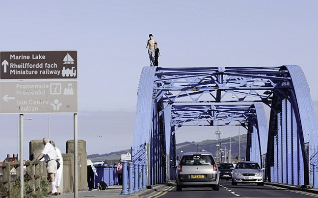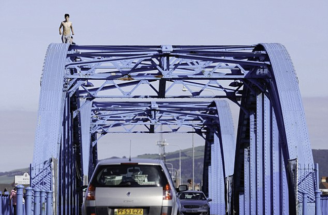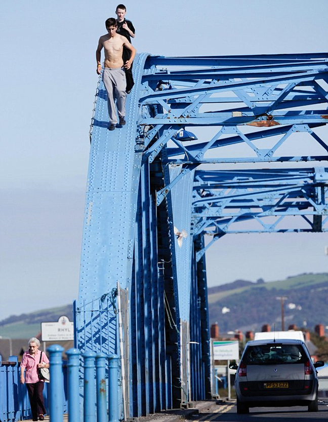 Υπάρχουν πολλά μέρη που μπορεί κανείς να κάνει τζόκινγκ, ειδικά στη Βρετανία. Αλλά οι δύο αυτοί έφηβοι φαίνεται πως ήθελαν να συνδυάσουν την ευχαρίστηση του τρεξίματος με την αδρεναλίνη κι έτσι ο φωτογραφικός φακός τους συνέλαβε να τρέχουν πάνω σε… γέφυρα, σε ύψος περίπου εννέα μέτρων πάνω από το δρόμο και δεκαπέντε μέτρων πάνω από τον ποταμό Clwyd στη Ουαλία.