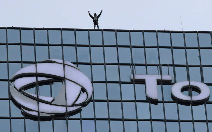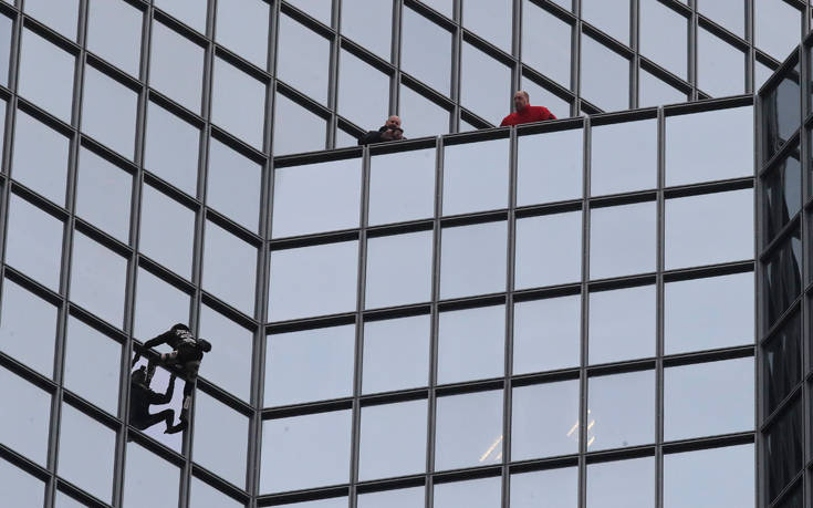 Ο 57χρονος Ρομπέρ στάθηκε όρθιος σηκώνοντας τα χέρια του ψηλά μόλις έφτασε στην κορυφή του ουρανοξύστη των 187 μέτρων, ο οποίος βρίσκεται στην περιοχή Λα Ντεφάνς του Παρισιού.