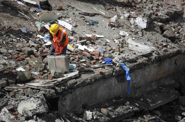 Εκσκαφείς προσπαθούν να μετακινήσουν μεγάλα κομμάτια μπετόν ώστε να επιτραπεί στα σωστικά συνεργεία να αρχίσουν το έργο του απεγκλωβισμού των ανθρώπων που καλούν σε βοήθεια.