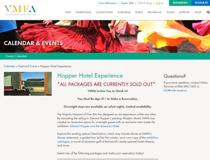 Το ενδιαφέρον ήταν τέτοιο που οι διανυκτερεύσεις μέχρι την ολοκλήρωση της έκθεσης είναι sold out, καθώς οι επισκέπτες, «μέσω της “Hopper Hotel Experience”, θα έχουν την ευκαιρία να διαμείνουν για μία νύχτα στο μουσείο, μέσα σε δωμάτιο του οποίου πηγή έμπνευσης ήταν ο πίνακας “Western Motel”», όπως εξηγεί το μουσείο στην ανακοίνωσή του.