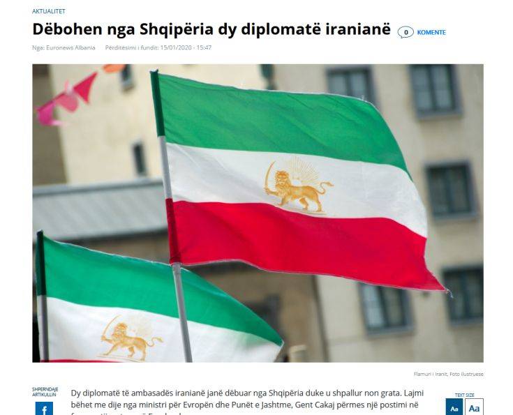 Η Αλβανία προχώρησε την Τετάρτη στην απέλαση δύο Ιρανών διπλωματών ως απάντηση στις δηλώσεις του ανώτατου πνευματικού ηγέτη του Ιράν Αλί Χαμενεΐ που δήλωσε ότι «υπάρχει μία πολύ μικρή, αλλά πολύ διαβολική ευρωπαϊκή χώρα, η Αλβανία, όπου αμερικανικά στοιχεία συνεργάζονται με Ιρανούς προδότες και σχεδιάζουν κατά της Ισλαμικής Δημοκρατίας».