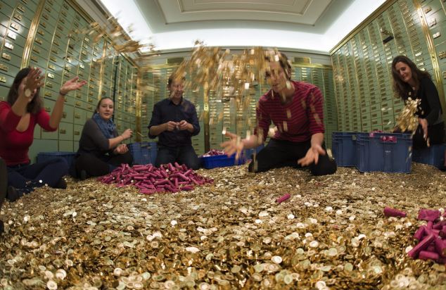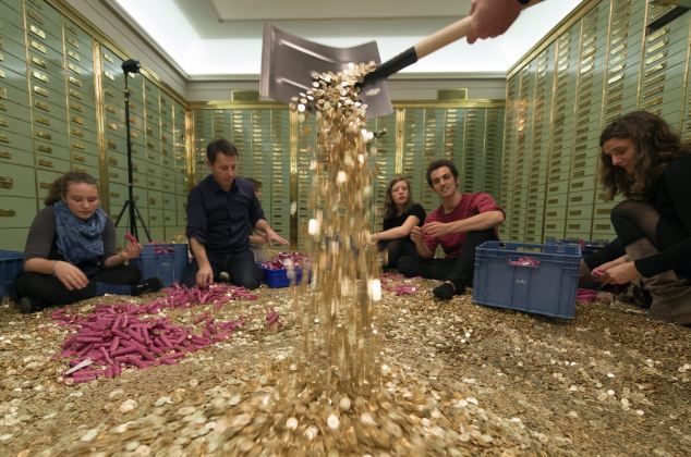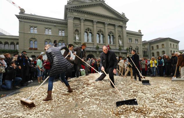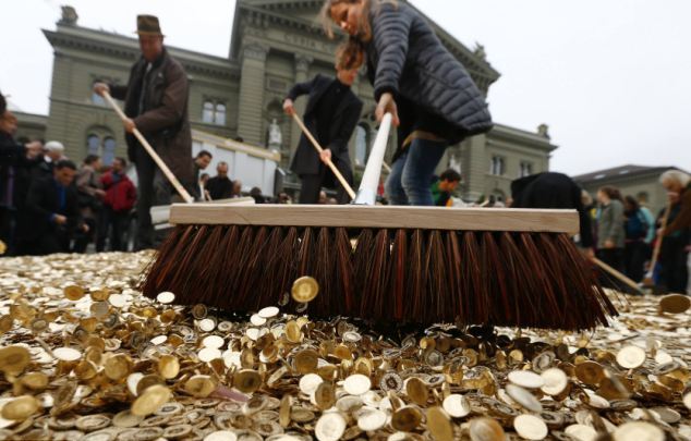 Μέλη της ομάδας «Generation Basic Income Initiative» συγκέντρωσαν 8 εκατομμύρια κέρματα των 5 σεντς, κάθε ένα εκ των οποίων αντιστοιχούσε σε ένα κάτοικο της χώρας από την τράπεζα Basler Volksbank στη Βασιλεία και στη συνέχεια, πέταξαν τους 15 τόνους μπροστά στο κτίριο της Βουλής στη Βέρνη.