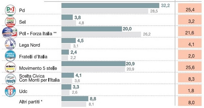 Συγκεκριμένα και μετά την διαφαινόμενη διάσπαση της κεντροδεξιάς και την επικράτηση του Αντζελίνο Αλφάνο, γενικού γραμματέα του Pdl-Forza Italia, συγκεντρώνουν μόλις το 20% των προτιμήσεων, με το MoVimento 5 Stelle του Μπέπε Γκρίλο να συγκεντρώνει το 20,9% των ψήφων.
