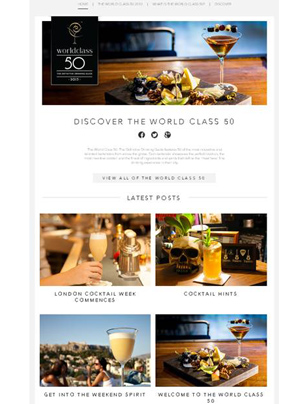Σε συνεργασία με παγκοσμίου φήμης guru των cocktail και των καλύτερων νέων ταλέντων του bartending, ο Οδηγός World Class 50 παρουσιάζει κορυφαίες προτάσεις για μοναδικές εμπειρίες, μέσα από την ιδιαίτερη ματιά των expert του χώρου, με τη συμμετοχή θρύλων του κλάδου όπως οι: Hidetsugu Ueno, Julie Reiner και Salvatore Calabrese, αλλά και νικητές του WORLD CLASS™ και νέους αστέρες του bartending όπως οι Tim Philips και Erik Lorincz.