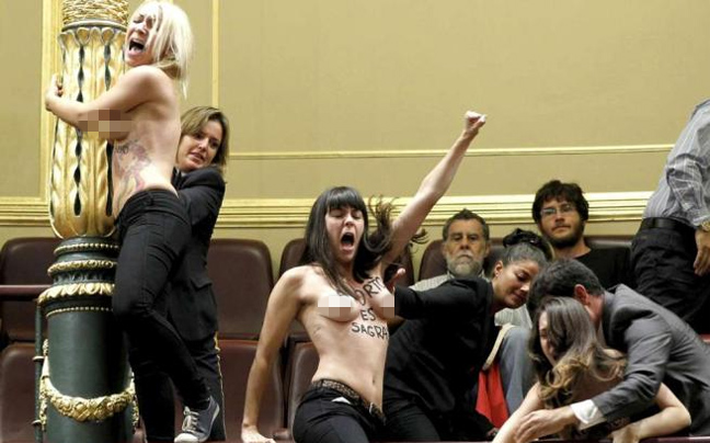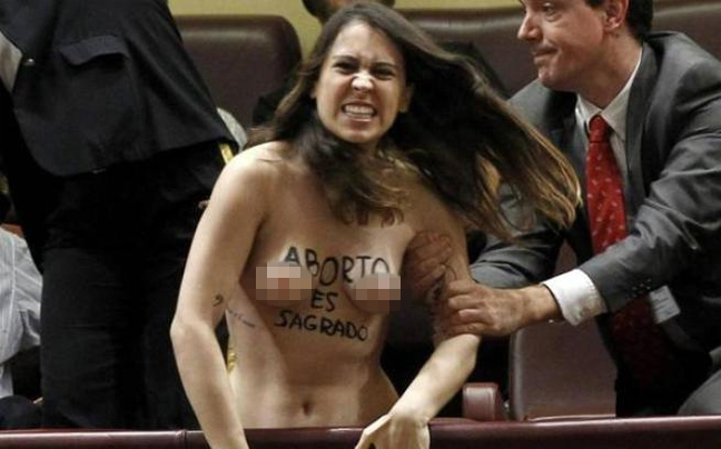 Η επεισοδιακή εμφάνιση της γυναικείας οργάνωσης πραγματοποιήθηκε στη διάρκεια μιας συζήτησης στη Βουλή και την ώρα που τον λόγο είχε ο Υπουργός Δικαιοσύνης Alberto Ruiz Gallardon και το σύνθημα που επικράτησε ήταν το «Η έκτρωση είναι ιερή».