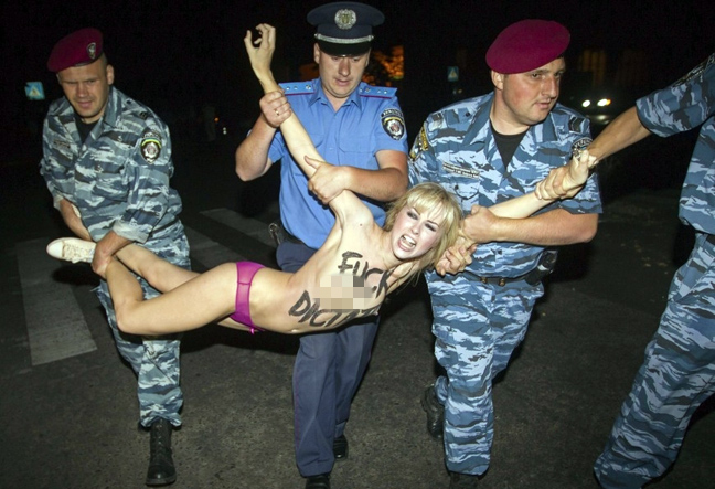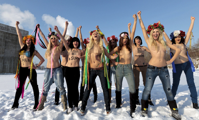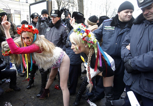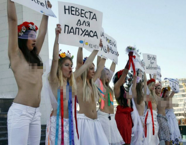 Η ακτιβιστική ομάδα σχηματίστηκε λοιπόν το 2008 για να παλέψει με την πορνεία, έγινε ωστόσο παγκόσμιο πρωτοσέλιδο πολύ αργότερα, το 2011, όταν σε απάντηση ραδιοφωνικού σόου της Νέας Ζηλανδίας που υποσχόταν στον νικητή του διαγωνισμού «την ουκρανή νύφη της επιλογής του», τα 9 ιδρυτικά μέλη της Femen παρατάχθηκαν στην Πλατεία Ανεξαρτησίας του Κιέβου ντυμένες με νυφικά, την ίδια ώρα που στο γυμνόστηθο στέρνο τους διάβαζε κανείς με κατάμαυρα γράμματα «Η Ουκρανία δεν είναι οίκος ανοχής» (σε 7 διαφορετικές μάλιστα γλώσσες).