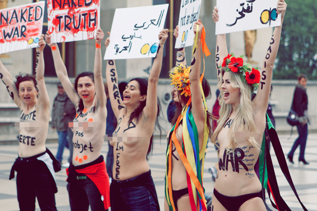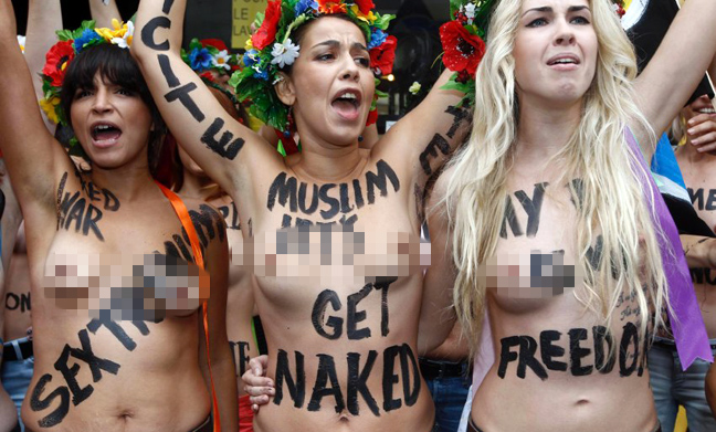 Όταν λοιπόν η Τυνήσια Amina Tyler ανέβασε στο Ίντερνετ δύο γυμνόστηθες φωτογραφίες της, με τα εύγλωττα αραβικά συνθήματα γραμμένα πάνω στο στέρνο της «γαμ… την ηθική σας» και «το σώμα μου δεν είναι πηγή τιμής για κανέναν άλλο», και απειλήθηκε ανοιχτά από τις Αρχές της Τυνησίας, η Femen έτρεξε σε συμπαράσταση, δράττοντας της ευκαιρίας να προωθήσει τα αντιμουσουλμανικά της αισθήματα: οι σεξτρεμίστριες κήρυξαν τη Διεθνή Μέρα Γυμνόστηθης Τζιχάντ!